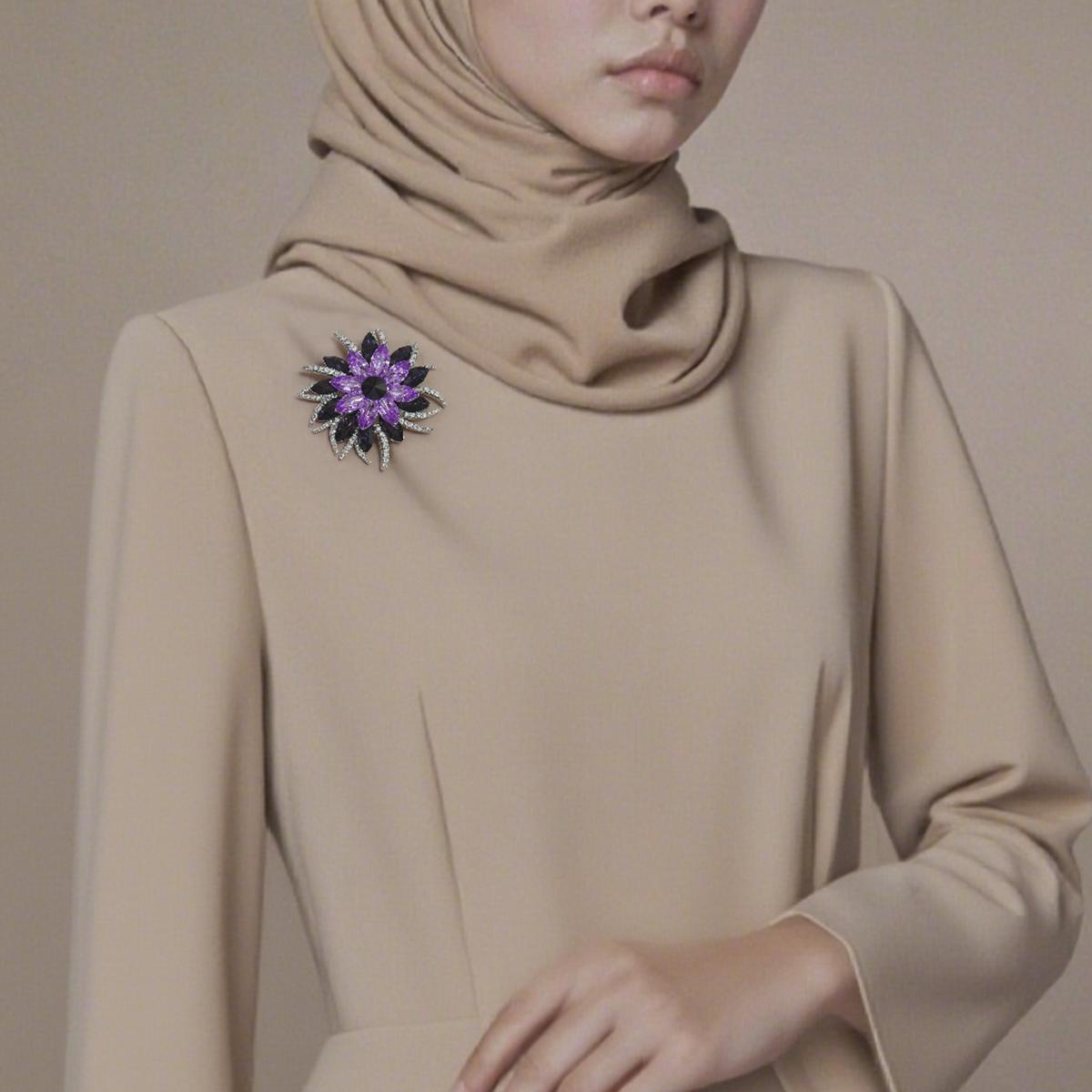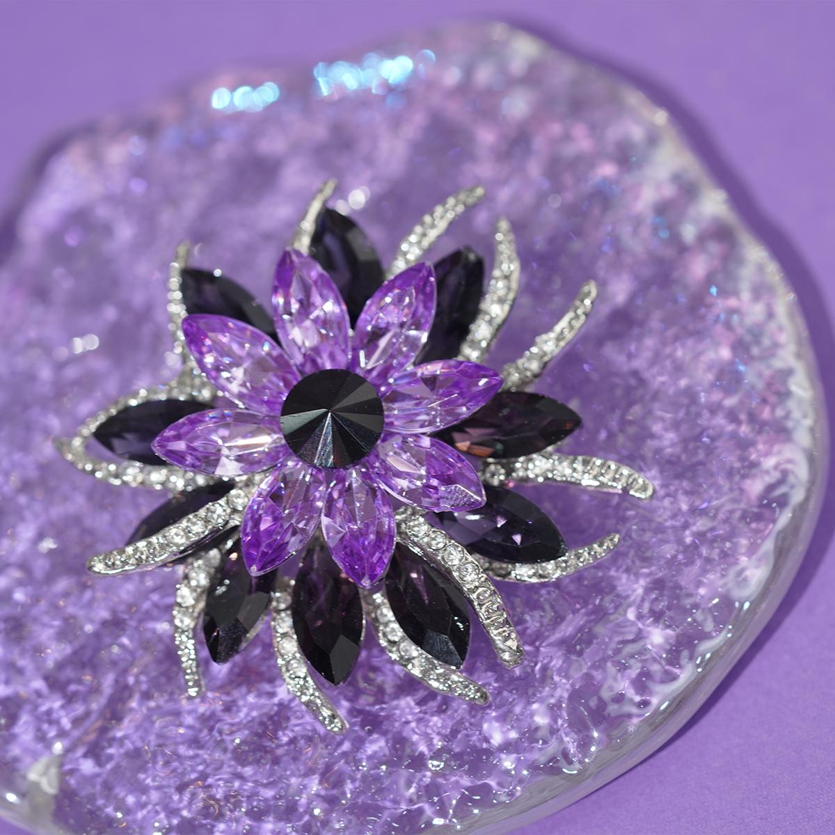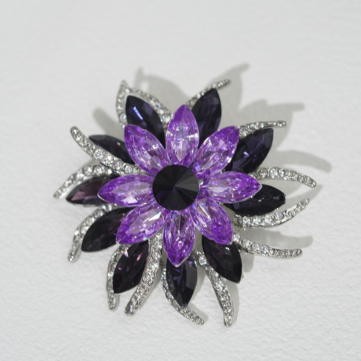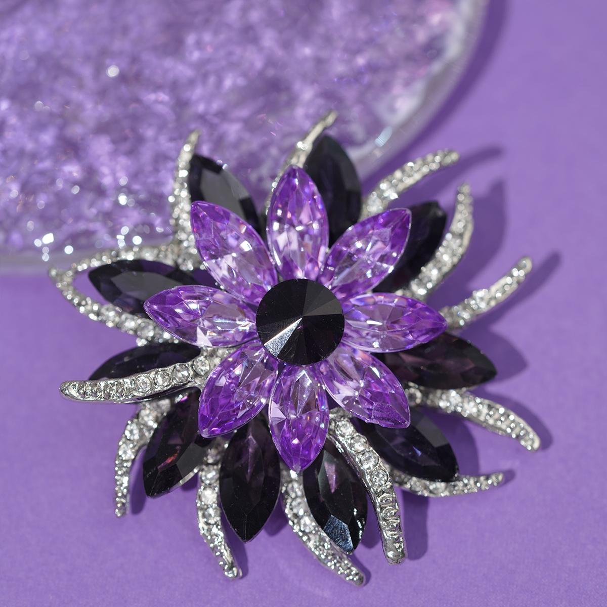 A geometrically floral brooch featuring gradient purple-to-black stones forming radial petals around a bold black centerpiece. Framed by foliage accents encrusted with clear sparkling stones, all secured with a durable pin clasp.