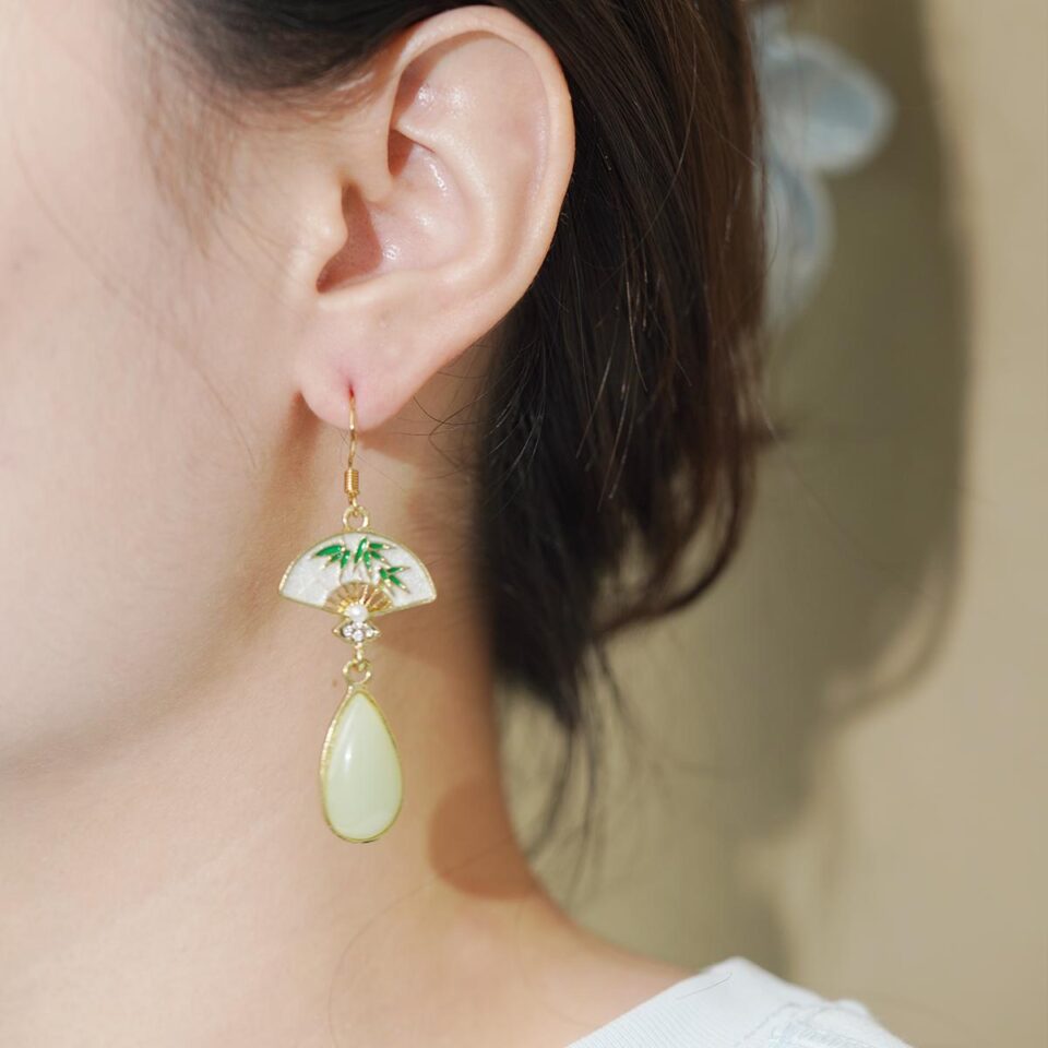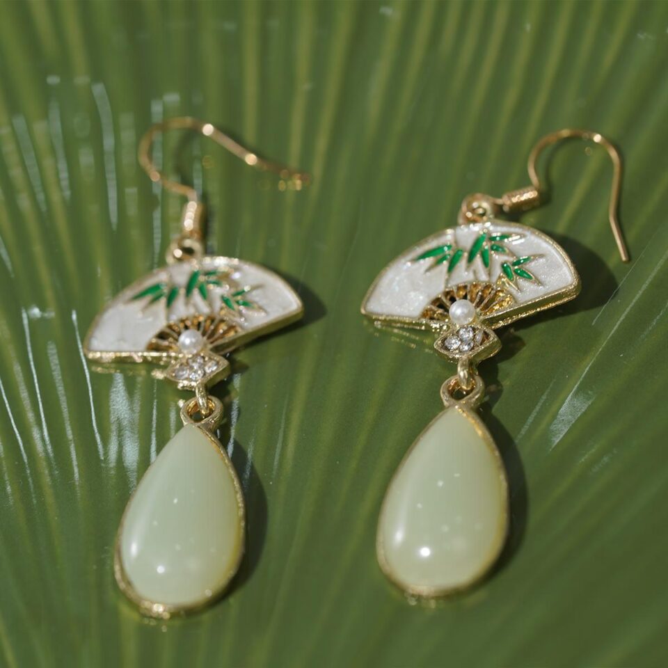 【Drop Earrings】White Enamel Fan – Shaped Bamboo Drop Earrings,Ethnic Gifts for Besties