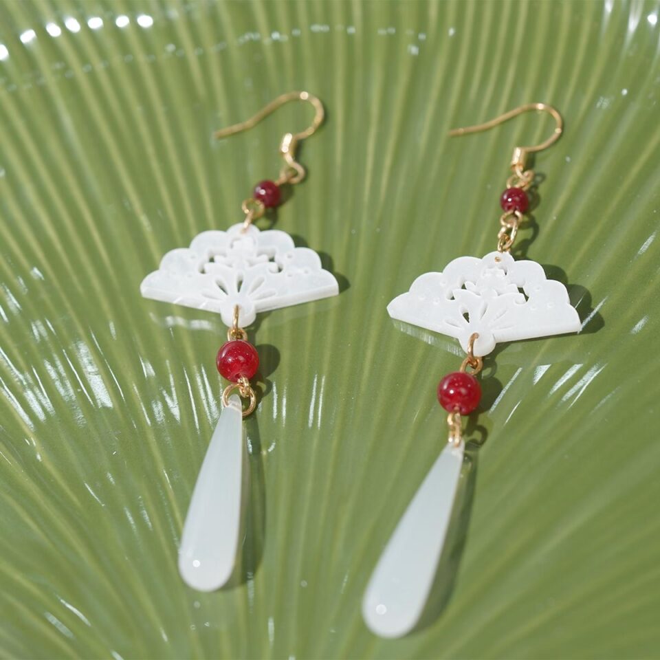 【Drop Earrings】White Resin Hollow Fan with Red Beads & Ivory Drops