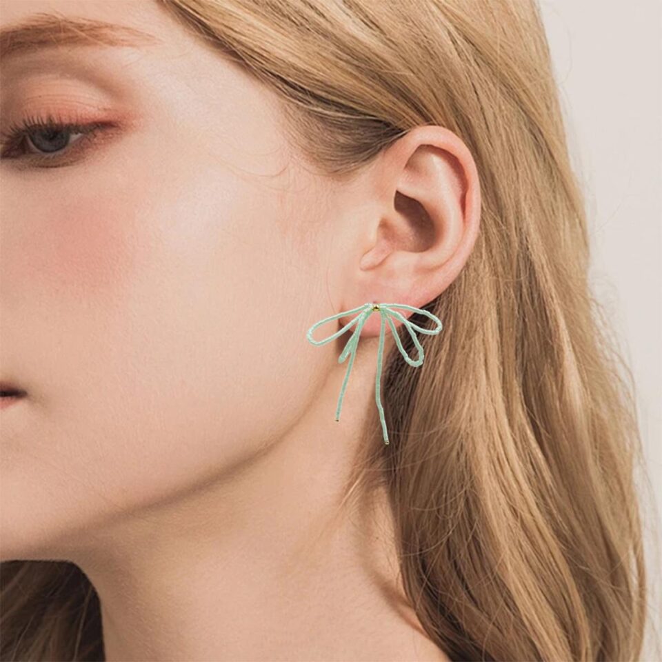 【Earrings】Light Green Bead Bow & S925 Dangle Earrings Minimalist Drop Design for Women