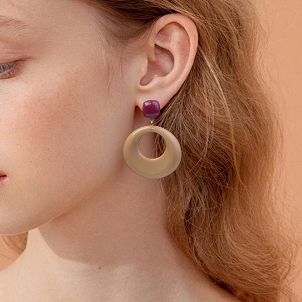 【Earrings】Women Burgundy & Tan Resin Geometric Earrings Gold Accent Lightweight Modern Daily Accent