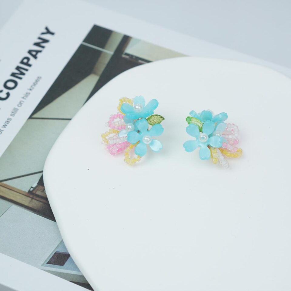 【Earrings】Resin Floral Earrings Pearl Center & Bead Fringe Lightweight Design for Girls’