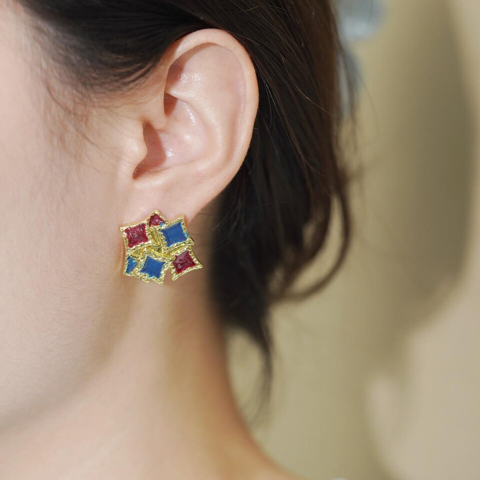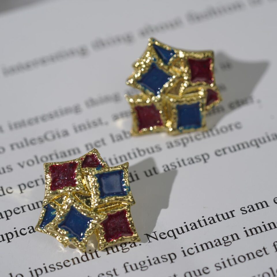 【Geometric Stud Earrings】Gold-Edged Blue-Red Glitter Enamel Stacked Rhombus for Daily Chick