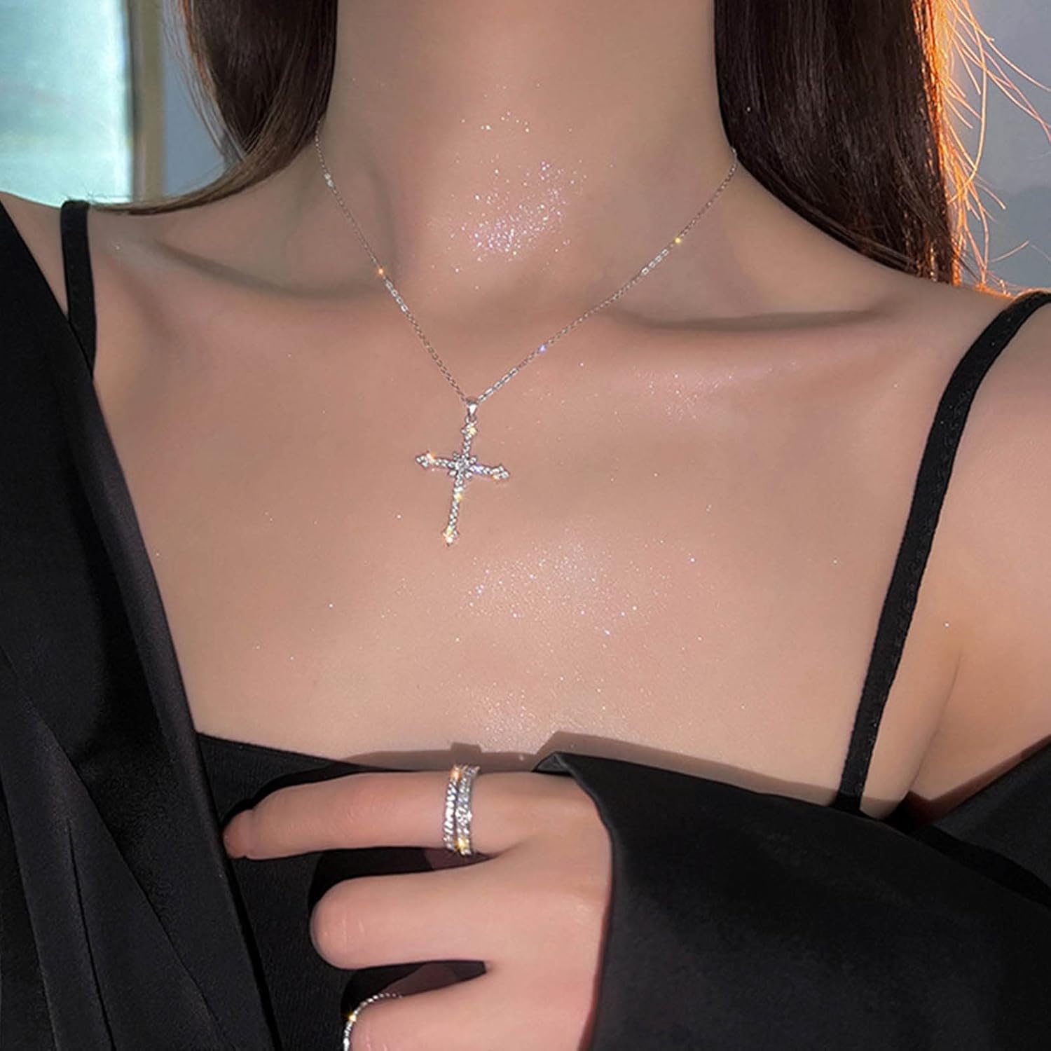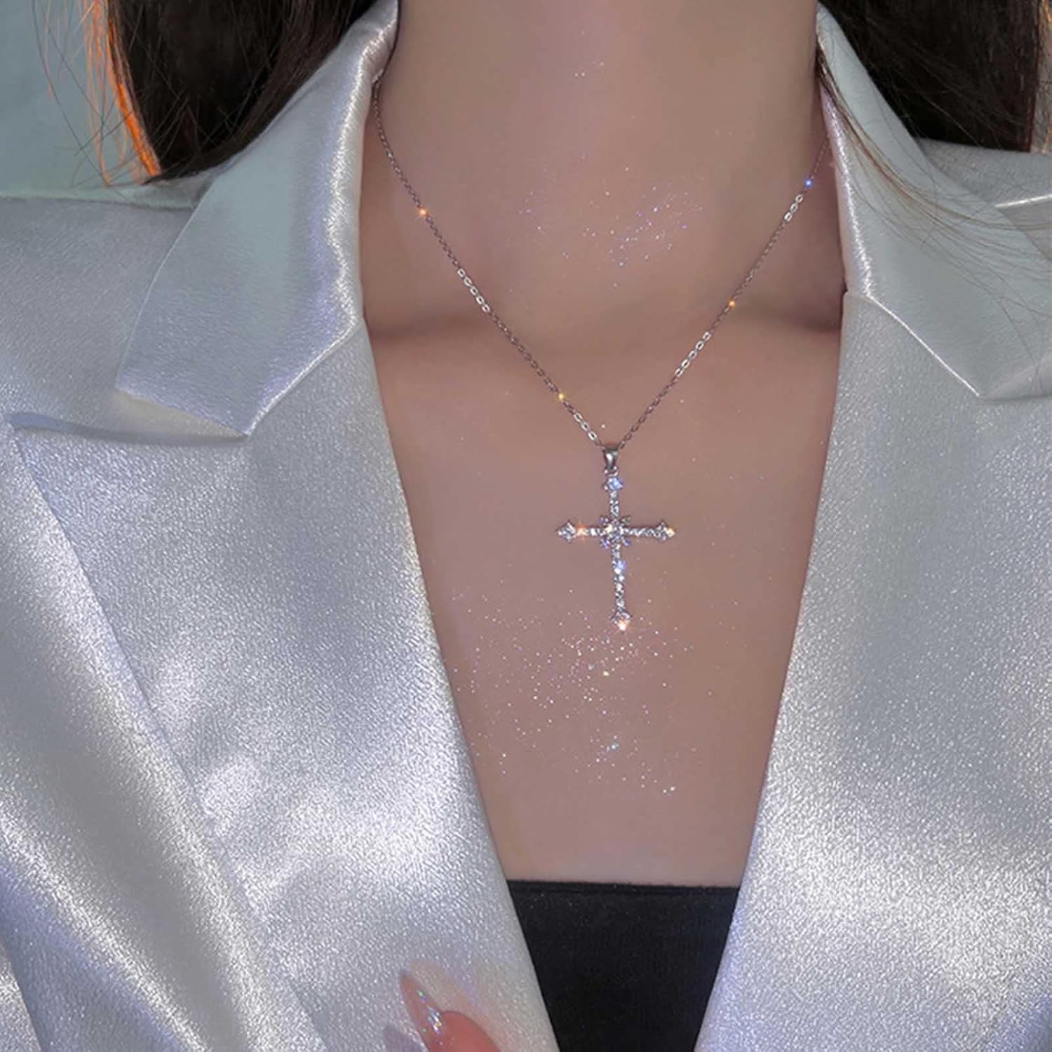 Silver Crystal Pray Cross Necklace Choker Chain CZ Stone Star Cross Pendant Necklace Crucifix Pendant Star Cross Charm Necklace Jewelry Gift for Women Girls